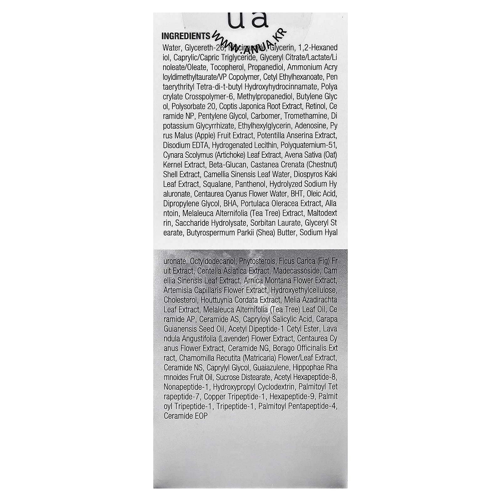 Eau, glycereth-26, nicotinamide (5 %), extrait de pomme, glycérol, 1,2-hexanediol, ester triple de glycérol et des acides caprylique et caprique, extrait de coquille de marronnier d'Afrique, glyceryl citrate/lactate/linoleate/oleate, extrait de feuille de kaki, extrait de racine de Coptis japonica, extrait de Potentilla anserina, extrait de grain d'avoine, extrait de feuille d'artichaut, extrait de pourpier, extrait de tea tree, extrait de figue, extrait d'herbe du tigre, extrait de feuille de thé vert, extrait de fleur d'armoise capillaire, extrait de fleur d'arnica, extrait de poivrier de Chine, extrait de feuille de margousier, extrait de lavande, extrait de fleur/feuille de camomille allemande, extrait de bourrache, extrait de fleur de bleuet des champs, lécithine hydrogénée, eau de feuille de thé vert, eau florale de bleuet, hyaluronate de sodium, huile essentielle de tea tree, huile de graine d'andiroba, huile de fruit d'argousier, tocophérol, propanediol, cetyl ethylhexanoate, polymère d'ammonium acryloyldimethyltaurate et de vinylpyrrolidone, pentaerythrityl tetra-di-t-butyl hydroxyhydrocinnamate, polyacrylate crosspolymer-6, méthylpropanediol, butylène glycol, dérivés de poly(oxy-1,2-éthanediyle) du monododécanoate de sorbitan, rétinol (0,11 %), céramide NP, pentylène glycol, carbomère, trométamol, glycyrrhizate de dipotassium, ethylhexyglycerin, adénosine, EDTA disodique, polyquaternium-51, bêta-glucane, squalane, panthénol, hyaluronate de sodium hydrolysé, butyl hydroxytoluène, acide oléique, dipropylène glycol, butyl hydroxyanisole, allantoïne, maltodextrine, saccharide hydrolysate, sorbitan laurate, stéarate de glycéryle, beurre de karité, octyldodécanol, stérols naturels, madécassoside, céramide AS, céramide AP, ester des acides salicylique et caprylique, cholestérol, hydroxyéthylcellulose, acetyl dipeptide-1 cetyl ester, céramide NS, céramide NG, caprylyl glycol, guaiazulene, distéarate de saccharose, nonapeptide-1, acetyl hexapeptide-8, tripeptide de cuivre-1, tripeptide-1, palmitoyl tetra-peptide-7 (dérivé de vitamine C), palmitoyl tripeptide-1, palmitoyl pentapeptide-4, cyclodextrine hydroxypropylée, hexapeptide-9, céramide EOP.