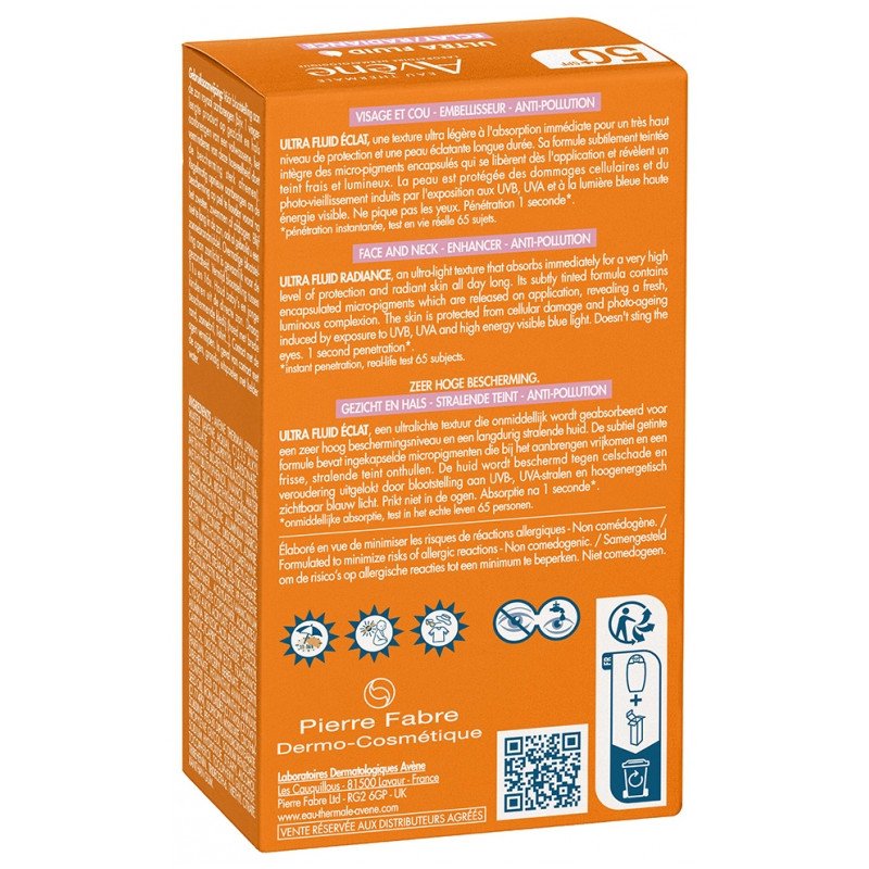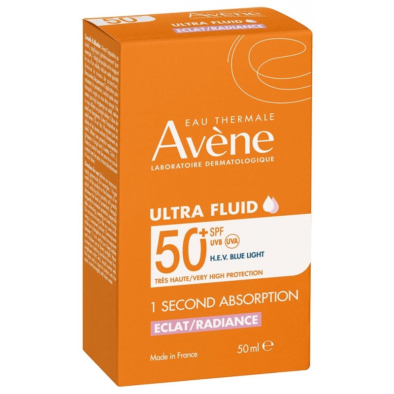 Avène Solaire Ultra Fluid Éclat SPF50+ 50 ml apporte une trés haute protection quotidienne contre les UVB, les UVA et la lumière bleue HEV pour prévenir le photovieillissement.