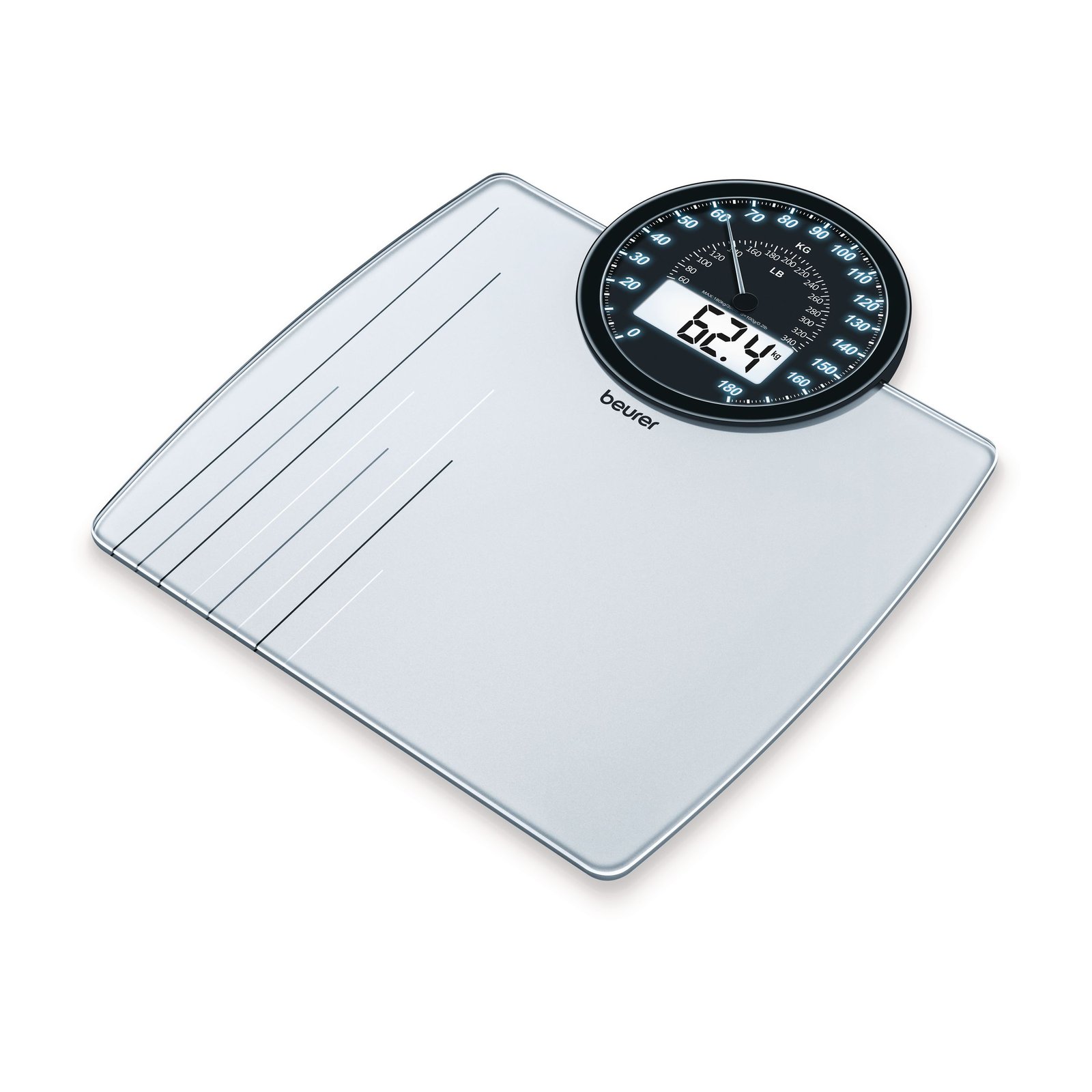 Le double écran analogique et numérique du pèse-personne en verre GS 58 de Beurer allie un design classique et moderne pour attirer tous les regards dans la salle de bains.