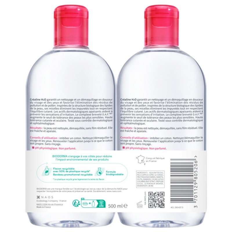 Bioderma Créaline H2O L’Eau Micellaire Originale Lot de 2 x 500 ml est une eau micellaire au pH physiologique qui garantit un nettoyage et un démaquillage en douceur du visage et des yeux, et favorise l’élimination des résidus de pollution et de pollen. Elle convient particulièrement aux peaux sensibles.