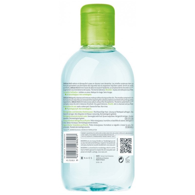 Bioderma Sébium H2O Solution Micellaire Nettoyante Purifiante 250 ml est une eau micellaire dermatologique qui nettoie, démaquille et purifie sans assécher la peau.