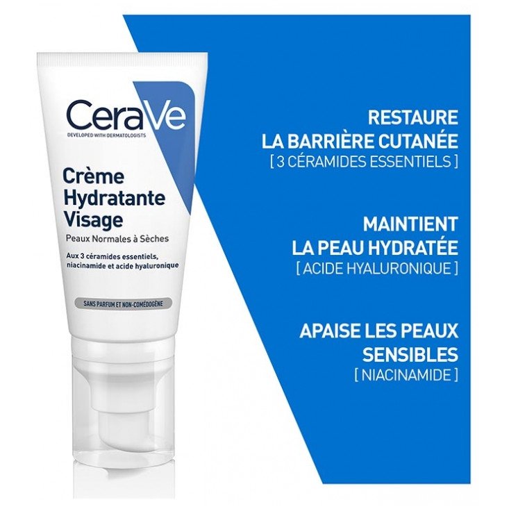 – CeraVe Crème Hydratante Visage 52 ml est une crème composée de 3 céramides essentiels, de niacinamide et d’acide hyaluronique qui nourrit, hydrate et aide à restaurer la barrière protectrice de la peau.