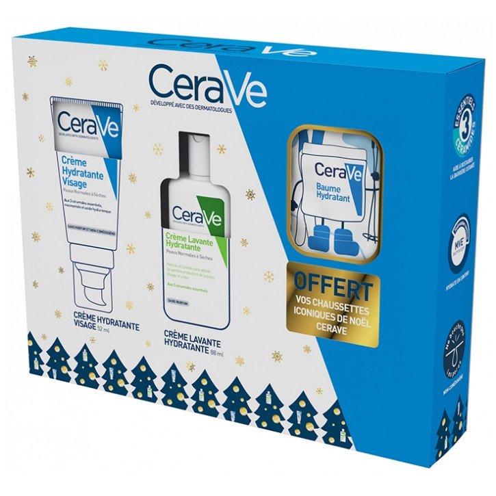CeraVe Crème Hydratante Visage 52 ml + Crème Lavante Hydratante 88 ml + Chaussettes Offertes apporte des soins hydratants pour le visage et le corps, adaptés aux besoins des peaux normales à sèches, ainsi qu’aux peaux desséchées par les traitements anti-acné.