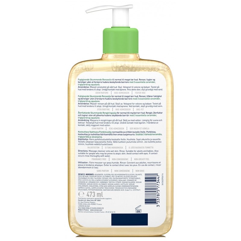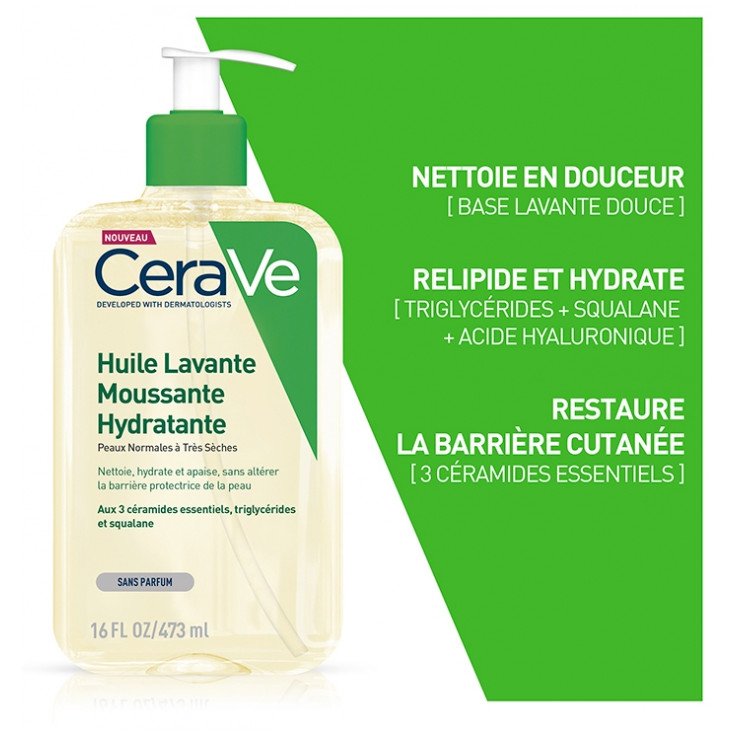 CeraVe Huile Lavante Moussante Hydratante 473 ml est un soin qui nettoie en douceur, relipide, hydrate les peaux normales à très sèches et les peaux à tendance atopique, tout en restaurant la barrière cutanée.