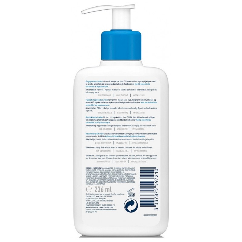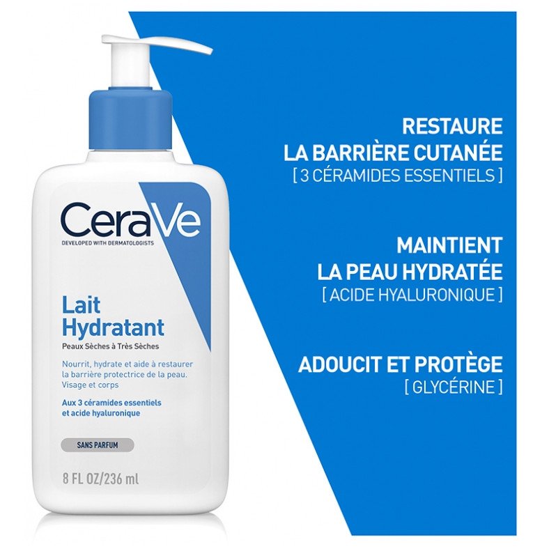 CeraVe Lait Hydratant 236 ml développé par des dermatologues, est un lait hydratant qui permet de nourrir et hydrater les peaux sèches à très sèches, visage et corps, sans altérer la barrière protectrice de la peau.