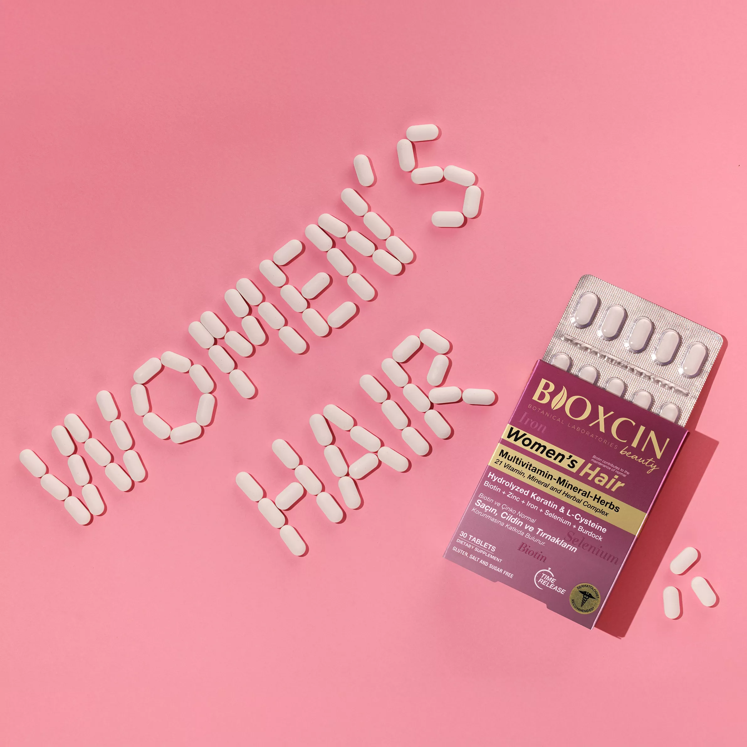 Il s’agit d’un complément alimentaire spécialement conçu pour les consommatrices, contenant de la kératine hydrolysée, du collagène hydrolysé, de la bardane, de l’acide folique, de la vitamine C, de l’extrait de racine d’ortie, de la L-cystéine, du sélénium, du fer, de la biotine et du zinc.