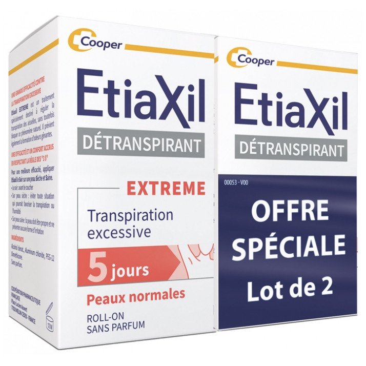Etiaxil Détranspirant Extrême Aisselles Peaux Normales Roll-On Lot de 2 x 15 ml est un traitement spécialement destiné à réguler la transpiration excessive des aisselles, sans toutefois bloquer ce phénomène naturel. Il prévient également la formation d’odeurs gênantes.