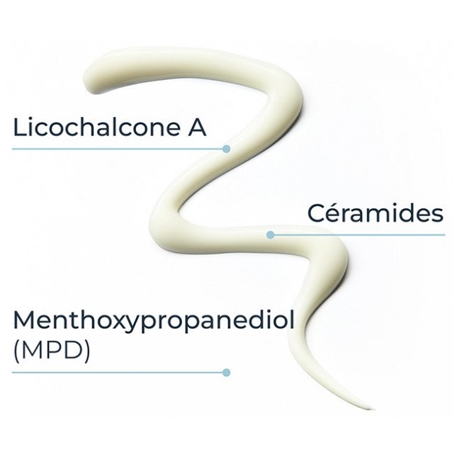 Sa formule est constituée d’un complexe d’ingrédients actifs : acides gras Oméga 6 régénérants (huile d’onagre et huile de pépins de raisin), Licochalcone A apaisante (extrait de racine de réglisse) et Decandiol anti-démangeaisons limitant la prolifération de bactéries, réparant aussi la peau afin de la soulager.