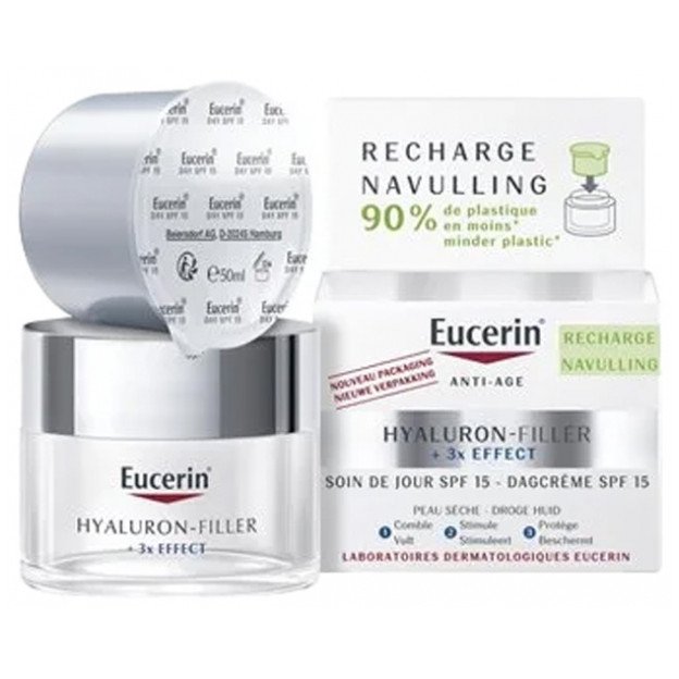 Eucerin Hyaluron-Filler + 3x Effect Soin de Jour SPF15 Peau Sèche Recharge 50 ml est un soin de jour anti-âge spécialement dédié aux peaux sèches. Sa formule au [Hyal] Complex lutte contre l’apparition des rides et le vieillissement cutané, elle :