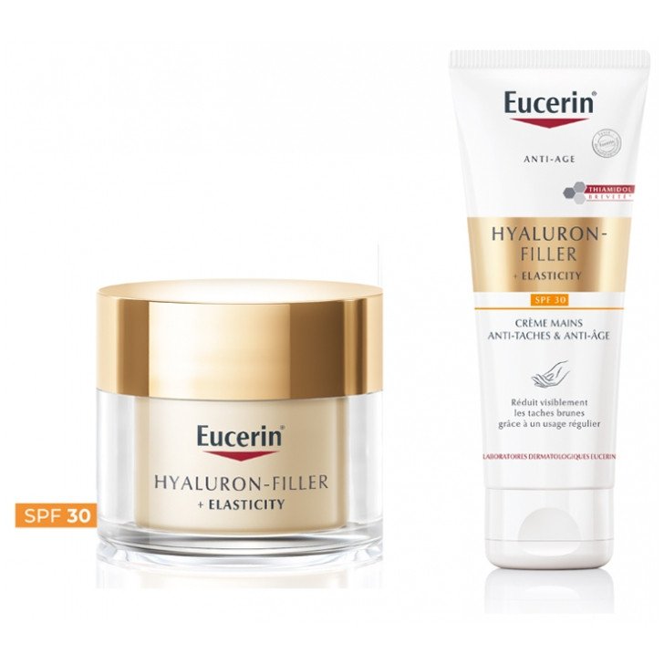 Eucerin Hyaluron-Filler Elasticity Soin de Jour SPF30 50 ml + Crème Mains Anti-Taches & Anti-Âge SPF30 75 ml apporte à votre peau une routine complète pour lutter contre les signes visibles du vieillissement cutané, tout en bénéficiant d’une protection solaire au quotidien.