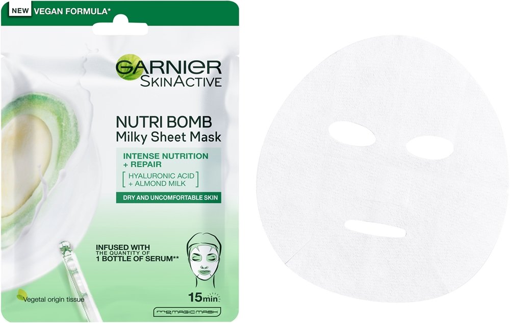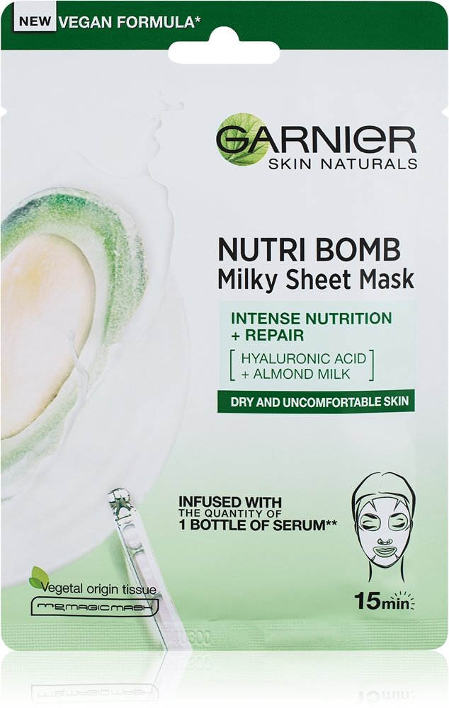 Le masque visage en tissu Garnier Skin Naturals Nutri Bomb Almond contient du lait d’amande, qui nourrit intensément la peau, ainsi que de l’acide hyaluronique, qui lui apporte une dose d’hydratation supplémentaire. Le masque tissu Garnier Skin Naturals Nutri Bomb convient aux peaux sèches, auxquelles il redonne souplesse et sensation de confort.