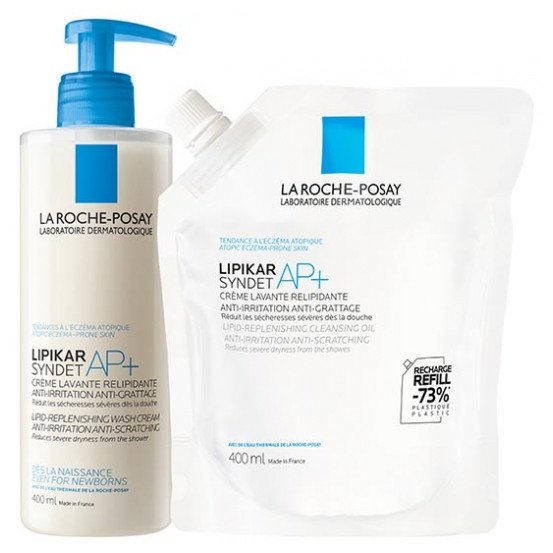 La Roche-Posay Lipikar Syndet AP+ 400 ml + Éco-Recharge 400 ml est une crème lavante relipidante ultra-douce pour le corps et le visage des bébés, enfants et adultes.