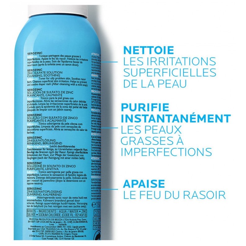 La Roche-Posay Serozinc 150 ml est une solution de sulfate de zinc et de chlorure de sodium.