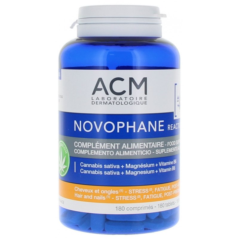 Laboratoire ACM Novophane Reactional 180 Comprimés est un complément alimentaire à base de cannabis sativa, magnésium et vitamine B6.
