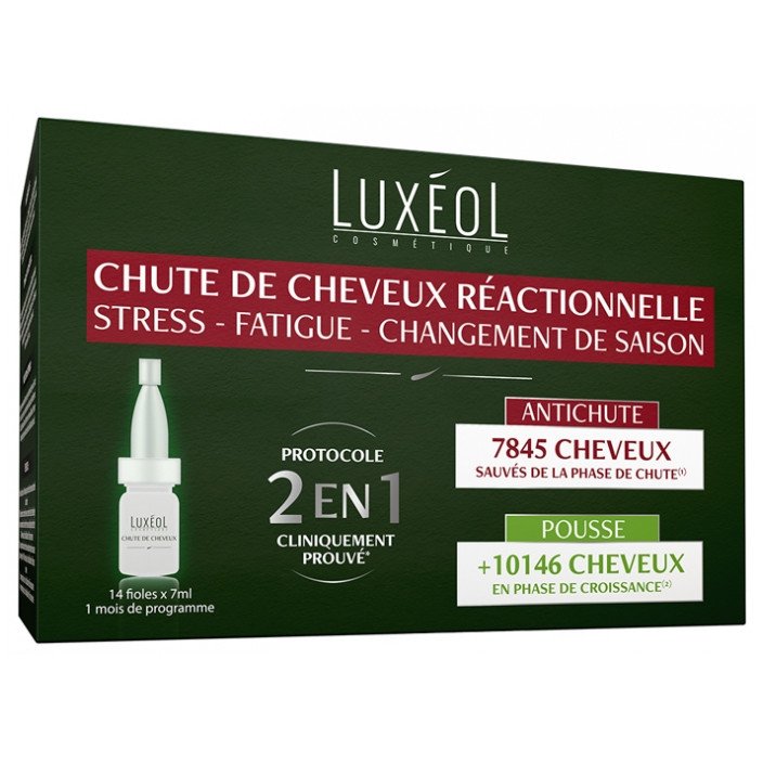 Luxéol Chute de Cheveux Réactionnelle 14 Fioles est un protocole 2 en 1 antichute de cheveux réactionnelle (liée au stress, à la fatigue, au changement de saison), qui favorise la pousse des cheveux. Il offre une double action :
