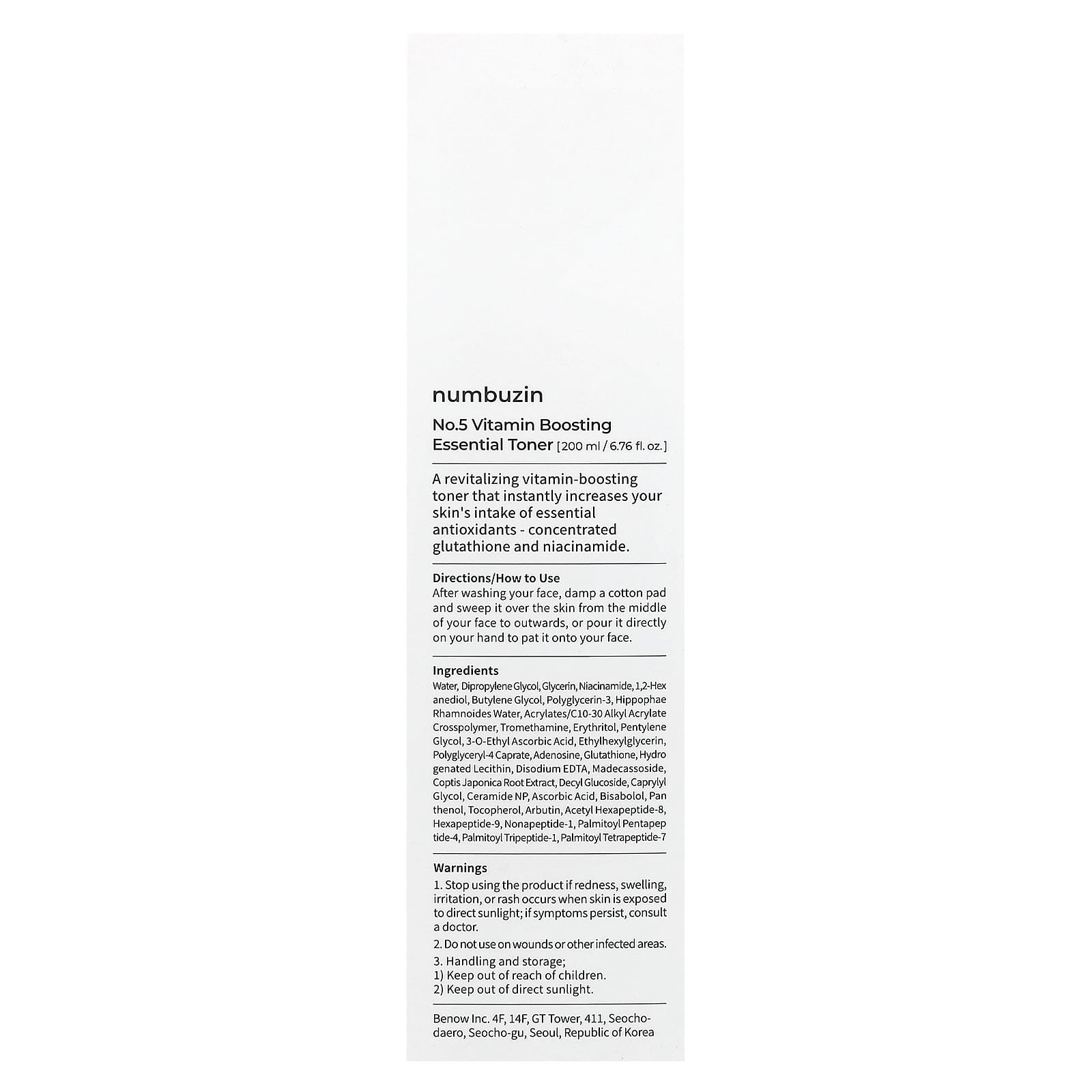 Eau, dipropylène glycol, glycérol, nicotinamide, 1,2-hexanediol, butylène glycol, triglycérol, eau d’argousier, polymère de propénoate d’alkyle en C10-C30, d’acide propénoïque, d’acide buténoïque et/ou de propénoates d’alkyle, produit avec de l’éther propénylique de saccharose ou du 2,2-dihydroxyméthyl-1,3-propanediol de propényle, trométamol, érythritol, pentylène glycol, 3-o-ethyl ascorbic acid, 3-(2-éthylhexyloxy)-1,2-propanediol, dérivé de glycérol et d’acide caprique, adénosine, glutathion, lécithine hydrogénée, EDTA disodique, madécassoside, extrait de racine de Coptis japonica, décyl glucoside, caprylyl glycol, céramide NP, acide ascorbique, bisabolol, panthénol, tocophérol, arbutine, acetyl hexapeptide-8, hexapeptide-9, nonapeptide-1, palmitoyl pentapeptide-4, palmitoyl tripeptide-1, palmitoyl tetrapeptide-7.