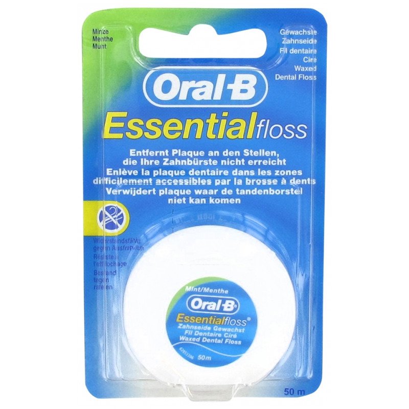 Oral-B Essential Floss Fil Dentaire Ciré Goût Menthe 50 m enlève la plaque dentaire dans les zones difficilement accessibles par la brosse à dents.