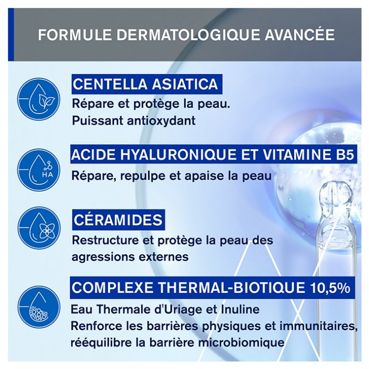 L’Eau Thermale d’Uriage aux propriétés hydratantes, protectrices et apaisantes associée à l’Inuline, un prébiotique, renforce les barrières physique et immunitaire de la peau, rééquilibre la barrière du microbiome. Il répare, régénère et apaise.