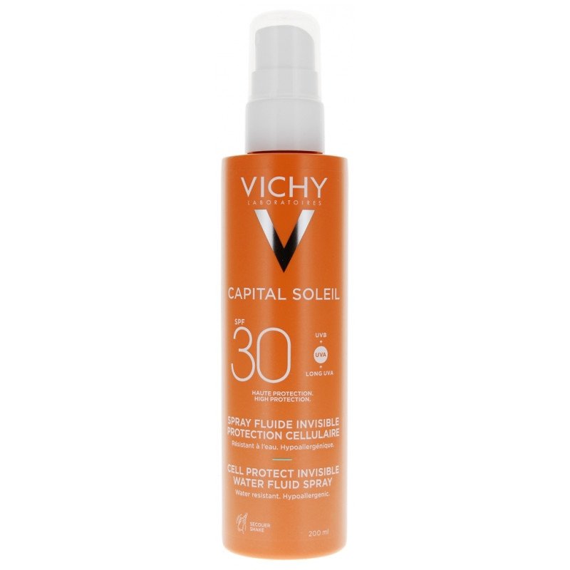 Vichy Capital Soleil Spray Fluide Invisible SPF30 200 ml est une haute protection solaire visage et corps, résistante à l’eau. Elle convient à tous types de peau et à tous les phototypes.