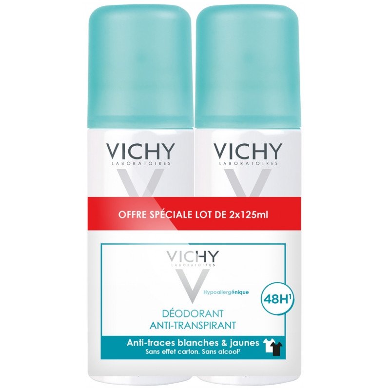 Vichy Déodorant Anti-Transpirant Anti-Traces Aérosol 48H Lot de 2 x 125 ml régule durablement la transpiration tout en laissant respirer la peau.