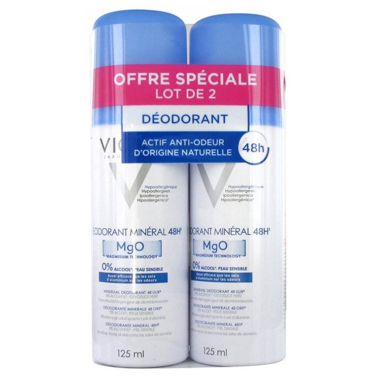 Vichy Déodorant Minéral 48H Lot de 2 x 125 ml est un déodorant minéral sans sels d’aluminium, sans alcool, sans paraben qui convient à toutes les peaux, même fraîchement épilées.
