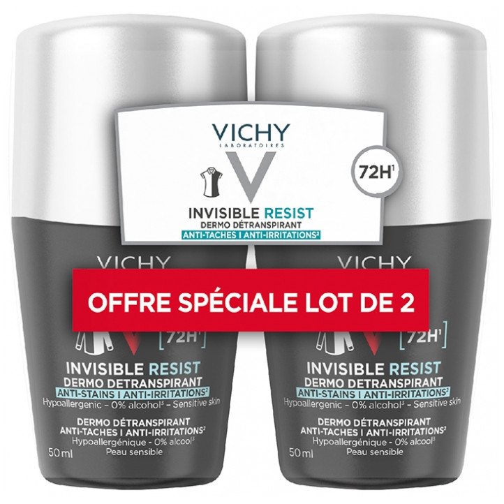 Vichy Homme Déodorant Invisible Resist Dermo-Détranspirant 72H Roll-On Lot de 2 x 50 ml est un déodorant détranspirant, anti-taches et anti-irritations, formulé spécialement pour les hommes.