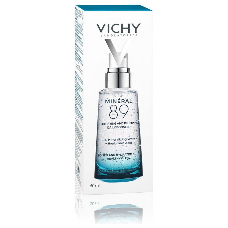 Vichy Minéral 89 Booster Quotidien Fortifiant et Repulpant 50 ml à la texture gélifiée et fraîche, fond instantanément sur la peau pour apporter éclat et santé immédiatement.